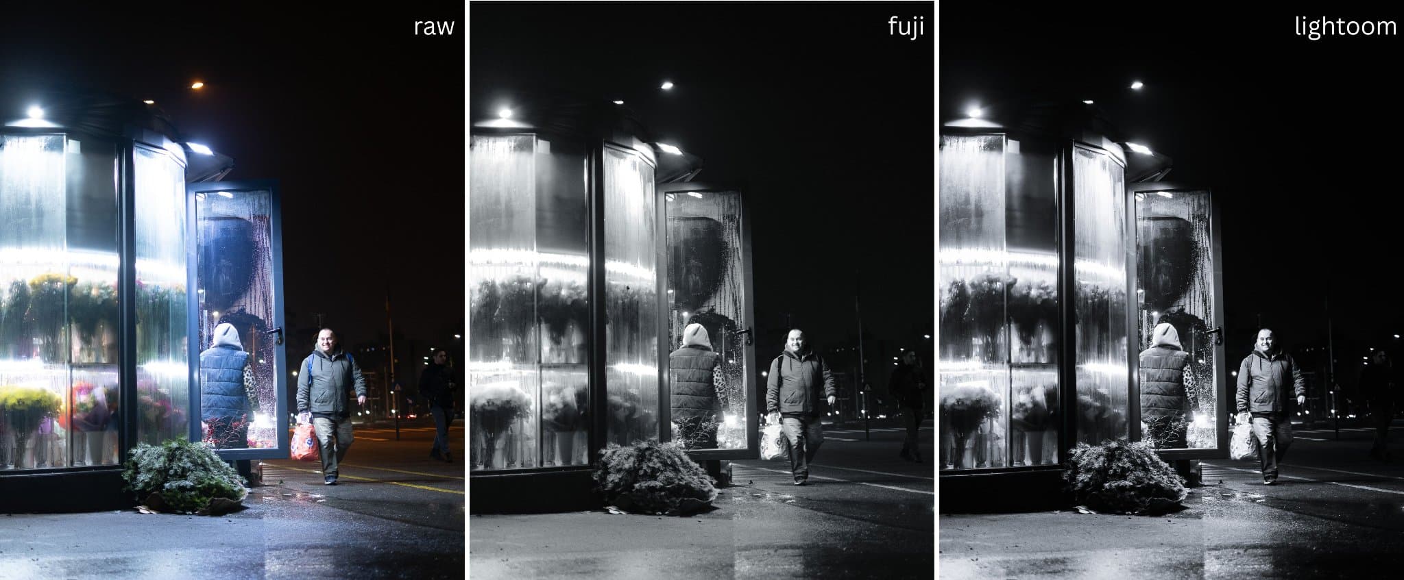 To truly understand how this recipe fits into my process, you need to see the progression. Below is a breakdown of the same image in three stages: the flat, data-rich RAW file; the in-camera JPEG using the 'Cold Contrast' recipe; and the final Lightroom edit.