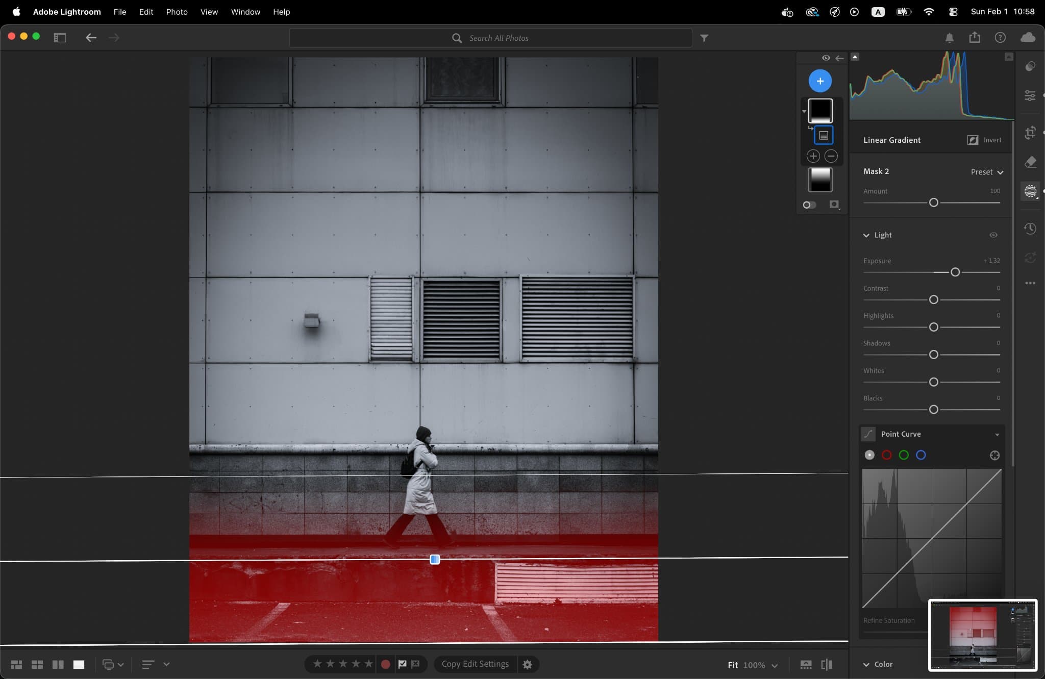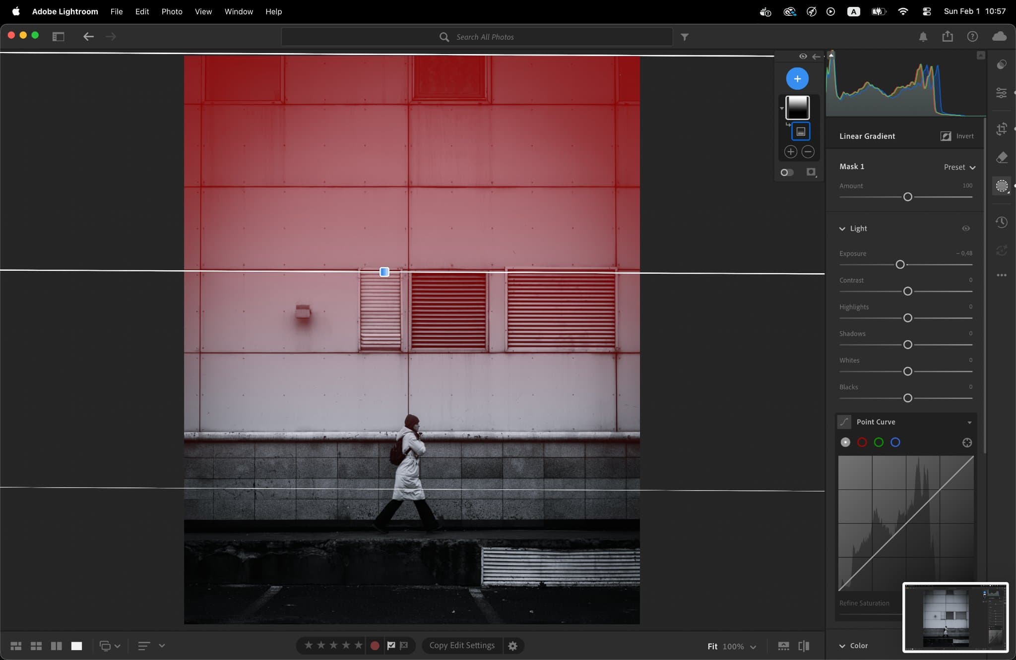 Global adjustments are just the beginning; I use masks to act as a digital "dodger and burner". I applied a Top-Down Linear Gradient to underexpose the upper facade, drawing the eye downward. This is balanced by a Bottom-Up Gradient to recover details in the street. Finally, a Radial Gradient centered on the subject with an exposure boost of +0.44 acts as a spotlight, ensuring the human element is the heart of the frame.