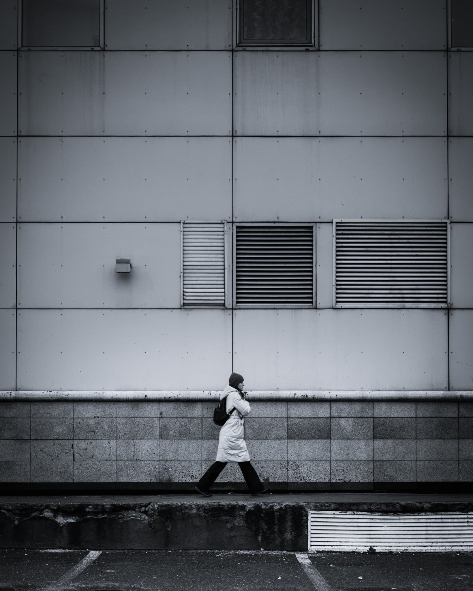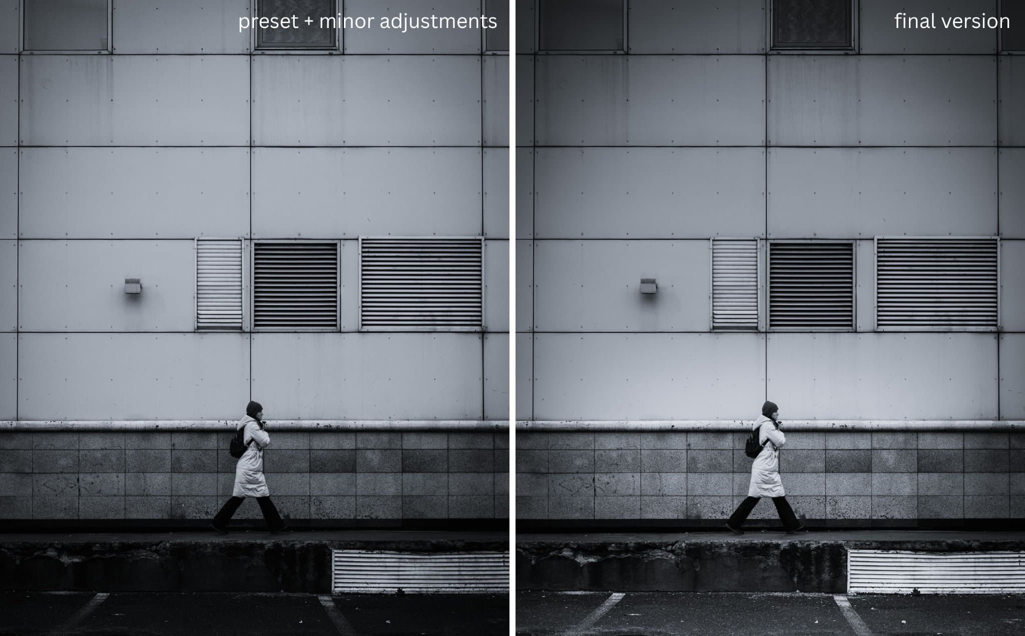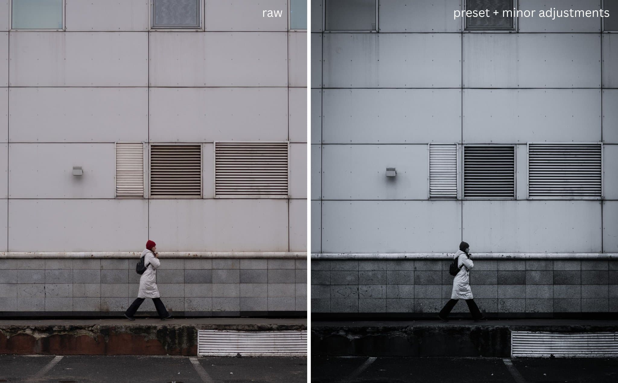 This is the true journey of the image. By comparing the original RAW file to the final version, you can see how the combination of global profiles and intentional masking transforms a simple street scene into a focused, atmospheric study of geometry and solitude.